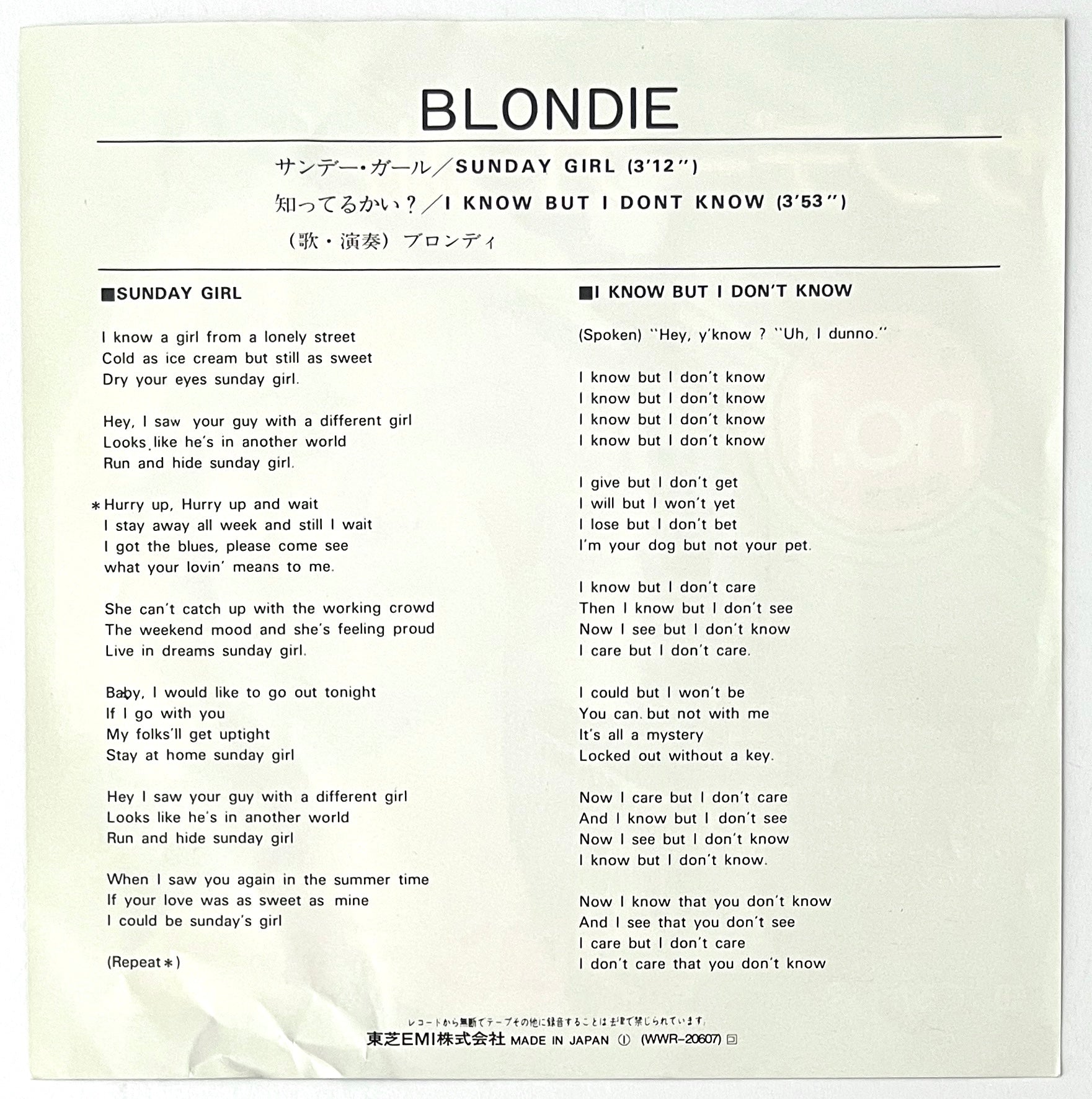Blondie - Sunday Girl (7” Single)
