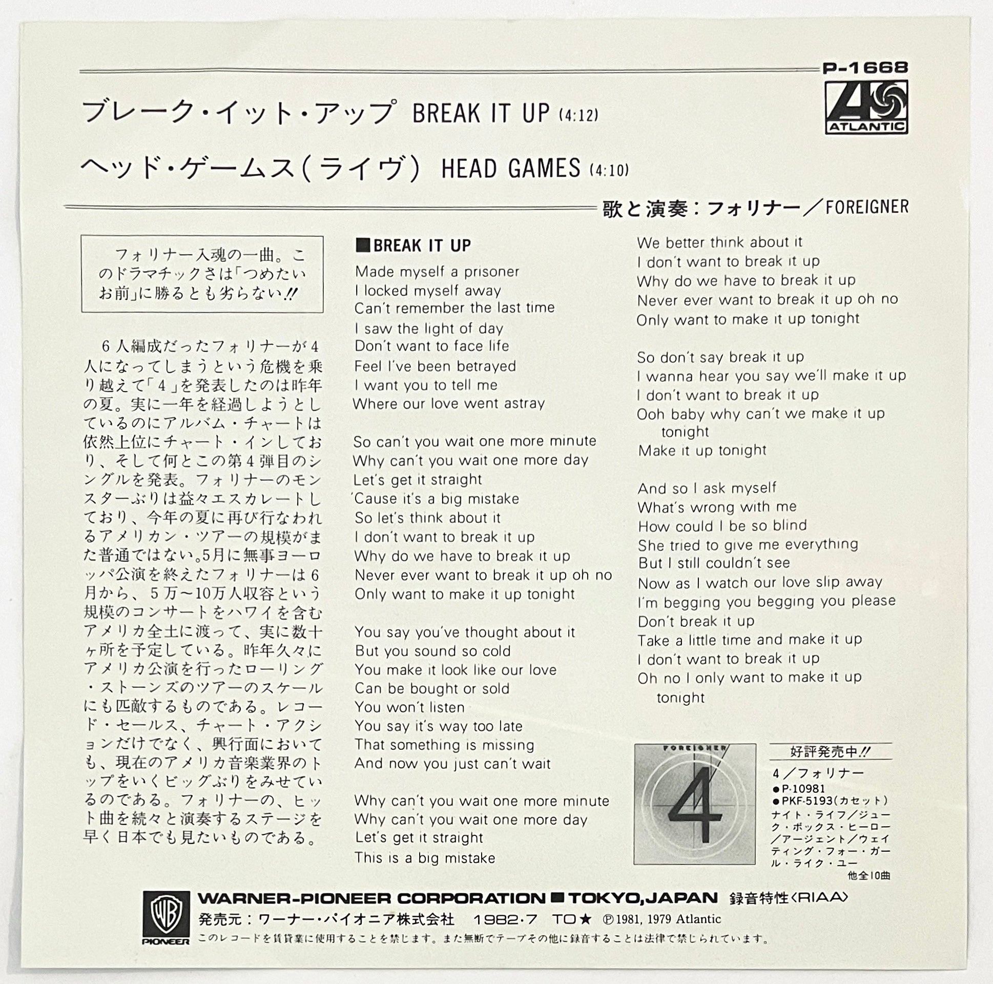Foreigner - Break It Up (7” Single)